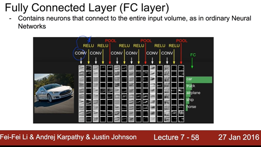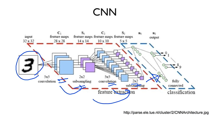 convolution, relu, pooling 반복하는 형태("feature extraction" part), 그 후 fully connected layer를 거침으로써 ("classification" part) 아래와 같이 이미지를 분류할 수 있습니다.